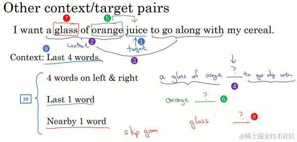 还有一个效果非常好的做法就是上下文是附近一个单词,它可能会告诉你单词glass(上图编号7所示)是一个邻近的单词。或者说我看见了单词glass,然后附近有一个词和glass位置相近,那么这个词会是什么(上图编号8所示)?这就是用附近的一个单词作为上下文。我们将在下节视频中把它公式化,这用的是一种Skip-Gram模型的思想。这是一个简单算法的例子,因为上下文相当的简单,比起之前4个词,现在只有1个,但是这种算法依然能工作得很好。