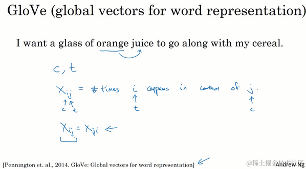 GloVe代表用词表示的全局变量(global vectors for word representation)。在此之前,我们曾通过挑选语料库中位置相近的两个词,列举出词对,即上下文和目标词,GloVe算法做的就是使其关系开始明确化。假定 是单词 在单词 上下文中出现的次数,那么这里 和 就和 和 的功能一样,所以你可以认为 等同于 。你也可以遍历你的训练集,然后数出单词 在不同单词 上下文中出现的个数,单词 在不同单词 的上下文中共出现多少次。根据上下文和目标词的定义,你大概会得出 等于 这个结论。事实上,如果你将上下文和目标词的范围定义为出现于左右各10词以内的话,那么就会有一种对称关系。如果你对上下文的选择是,上下文总是目标词前一个单词的话,那么 和 就不会像这样对称了。不过对于GloVe算法,我们可以定义上下文和目标词为任意两个位置相近的单词,假设是左右各10词的距离,那么 就是一个能够获取单词 和单词 出现位置相近时或是彼此接近的频率的计数器。