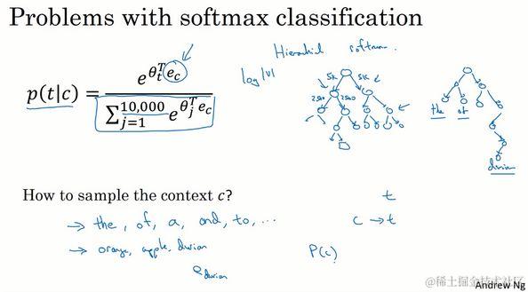 实际上使用这个算法会遇到一些问题,首要的问题就是计算速度。尤其是在softmax模型中,每次你想要计算这个概率,你需要对你词汇表中的所有10,000个词做求和计算,可能10,000个词的情况还不算太差。如果你用了一个大小为100,000或1,000,000的词汇表,那么这个分母的求和操作是相当慢的,实际上10,000已经是相当慢的了,所以扩大词汇表就更加困难了。