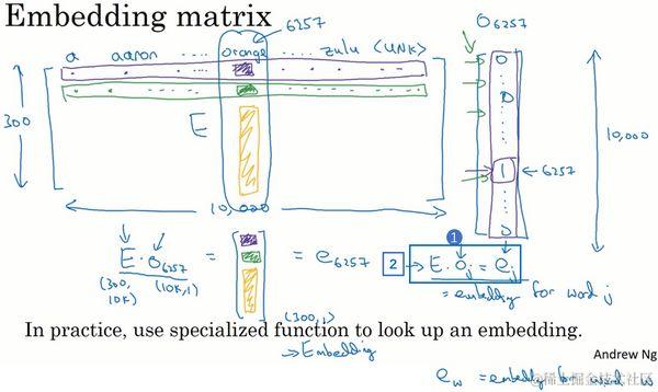 在这一小节中,要记住的一件事就是我们的目标是学习一个嵌入矩阵 。在下节视频中你将会随机地初始化矩阵 ,然后使用梯度下降法来学习这个300×10,000的矩阵中的各个参数, 乘以这个one-hot向量(上图编号1所示)会得到嵌入向量。再多说一点,当我们写这个等式(上图编号2所示)的时候,写出这些符号是很方便的,代表用矩阵 乘以one-hot向量 。但当你动手实现时,用大量的矩阵和向量相乘来计算它,效率是很低下的,因为one-hot向量是一个维度非常高的向量,并且几乎所有元素都是0,所以矩阵向量相乘效率太低,因为我们要乘以一大堆的0。所以在实践中你会使用一个专门的函数来单独查找矩阵 的某列,而不是用通常的矩阵乘法来做,但是在画示意图时(上图所示,即矩阵 乘以one-hot向量示意图),这样写比较方便。但是例如在Keras中就有一个嵌入层,然后我们用这个嵌入层更有效地从嵌入矩阵中提取出你需要的列,而不是对矩阵进行很慢很复杂的乘法运算。