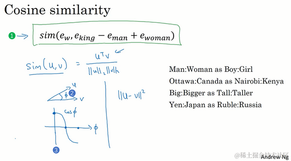 现在我们先不看分母,分子其实就是 和 的内积。如果u和v非常相似,那么它们的内积将会很大,把整个式子叫做余弦相似度,其实就是因为该式是 和 的夹角的余弦值,所以这个角(下图编号2所示)就是Φ角,这个公式实际就是计算两向量夹角Φ角的余弦。你应该还记得在微积分中,Φ角的余弦图像是这样的(下图编号3所示),所以夹角为0度时,余弦相似度就是1,当夹角是90度角时余弦相似度就是0,当它们是180度时,图像完全跑到了相反的方向,这时相似度等于-1,这就是为什么余弦相似度对于这种类比工作能起到非常好的效果。距离用平方距离或者欧氏距离来表示: