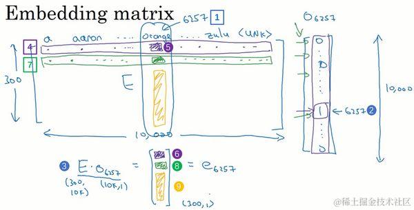 假设这个嵌入矩阵叫做矩阵 ,注意如果用 去乘以右边的one-hot向量(上图编号3所示),也就是 ,那么就会得到一个300维的向量, 是300×10,000的, 是10,000×1的,所以它们的积是300×1的,即300维的向量。要计算这个向量的第一个元素,你需要做的是把 的第一行(上图编号4所示)和 的整列相乘,不过 的所有元素都是0,只有6257位置上是1,最后你得到的这个向量的第一个元素(上图编号5所示)就是orange这一列下的数字(上图编号6所示)。然后我们要计算这个向量的第二个元素,就是把 的第二行(上图编号7所示)和这个 相乘,和之前一样,然后得到第二个元素(上图编号8所示),以此类推,直到你得到这个向量剩下的所有元素(上图编号9所示)。