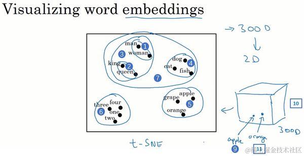 在网上你可能会看到像这样的图用来可视化,300维或者更高维度的嵌入。希望你能有个整体的概念,这种词嵌入算法对于相近的概念,学到的特征也比较类似,在对这些概念可视化的时候,这些概念就比较相似,最终把它们映射为相似的特征向量。这种表示方式用的是在300维空间里的特征表示,这叫做嵌入(embeddings)。之所以叫嵌入的原因是,你可以想象一个300维的空间,我画不出来300维的空间,这里用个3维的代替(上图编号8所示)。现在取每一个单词比如orange,它对应一个3维的特征向量,所以这个词就被嵌在这个300维空间里的一个点上了(上图编号9所示),apple这个词就被嵌在这个300维空间的另一个点上了(上图编号10所示)。为了可视化,t-SNE算法把这个空间映射到低维空间,你可以画出一个2维图像然后观察,这就是这个术语嵌入的来源。