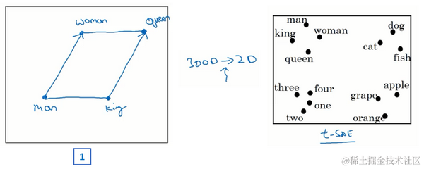 在继续下一步之前,我想再说明一下左边的这幅图(上图编号1所示),在之前我们谈到过用t-SNE算法来将单词可视化。t-SNE算法所做的就是把这些300维的数据用一种非线性的方式映射到2维平面上,可以得知t-SNE中这种映射很复杂而且很非线性。在进行t-SNE映射之后,你不能总是期望使等式成立的关系,会像左边那样成一个平行四边形,尽管在这个例子最初的300维的空间内你可以依赖这种平行四边形的关系来找到使等式成立的一对类比,通过t-SNE算法映射出的图像可能是正确的。但在大多数情况下,由于t-SNE的非线性映射,你就没法再指望这种平行四边形了,很多这种平行四边形的类比关系在t-SNE映射中都会失去原貌。