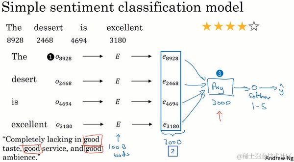 接下来你可以这样做,这节我们会讲几个不同的算法。这是一个简单的情感分类的模型,假设有一个句子"dessert is excellent",然后在词典里找这些词,我们通常用10,000个词的词汇表。我们要构建一个分类器能够把它映射成输出四个星,给定这四个词("dessert is excellent"),我们取这些词,找到相应的one-hot向量,所以这里(上图编号1所示)就是 ,乘以嵌入矩阵 , 可以从一个很大的文本集里学习到,比如它可以从一亿个词或者一百亿个词里学习嵌入,然后用来提取单词the的嵌入向量 ,对dessert、is、excellent做同样的步骤。