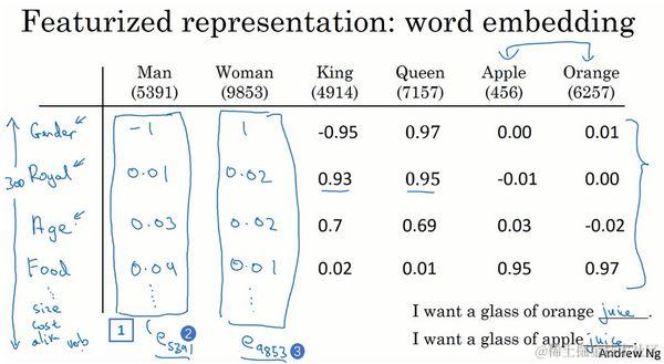所以你可以想很多的特征,为了说明,我们假设有300个不同的特征,这样的话你就有了这一列数字(上图编号1所示),这里我只写了4个,实际上是300个数字,这样就组成了一个300维的向量来表示man这个词。接下来,我想用 这个符号来表示,就像这样(上图编号2所示)。同样这个300维的向量,我用 代表这个300维的向量用来表示woman这个词(上图编号3所示),这些其他的例子也一样。现在,如果用这种表示方法来表示apple和orange这些词,那么apple和orange的这种表示肯定会非常相似,可能有些特征不太一样,因为orange的颜色口味,apple的颜色口味,或者其他的一些特征会不太一样,但总的来说apple和orange的大部分特征实际上都一样,或者说都有相似的值。这样对于已经知道orange juice的算法很大几率上也会明白apple juice这个东西,这样对于不同的单词算法会泛化的更好。