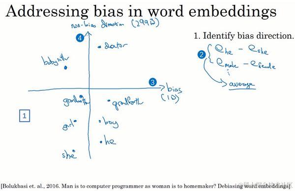本节视频里我想要做的是与你们分享一个例子,它是一篇论文的一套办法,就是下面引用的这篇由Bolukbasi和其他人共同撰写的论文,它是研究减少词嵌入中偏见问题的。就是这些,假设说我们已经完成一个词嵌入的学习,那么babysitter就是在这里,doctor在这里,grandmother在这里,grandfather在这里,也许girl嵌入在这里,boy嵌入在这里,也许she嵌在这里,he在这里(上图编号1所示的区域内),所以首先我们要做的事就是辨别出我们想要减少或想要消除的特定偏见的趋势。