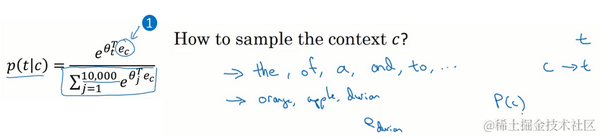 这个模型基于逻辑回归模型,但不同的是我们将一个sigmoid函数作用于 ,参数和之前一样,你对每一个可能的目标词有一个参数向量 和另一个参数向量 ,即每一个可能上下文词的的嵌入向量,我们将用这个公式估计 的概率。如果你有 个样本,你可以把这个看作 的正负样本比例,即每一个正样本你都有 个对应的负样本来训练一个类似逻辑回归的模型。