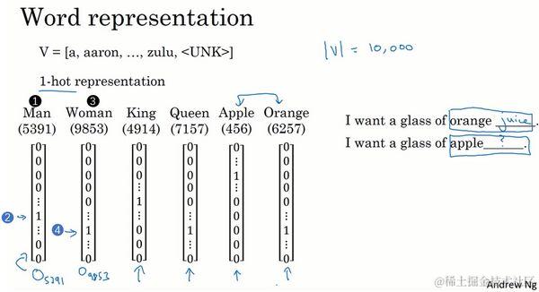 举个例子,假如你已经学习到了一个语言模型,当你看到“I want a glass of orange ___ ”,那么下一个词会是什么?很可能是juice。即使你的学习算法已经学到了“I want a glass of orange juice”这样一个很可能的句子,但如果看到“I want a glass of apple ___ ”,因为算法不知道apple和orange的关系很接近,就像man和woman,king和queen一样。所以算法很难从已经知道的orange juice是一个常见的东西,而明白apple juice也是很常见的东西或者说常见的句子。这是因为任何两个one-hot向量的内积都是0,如果你取两个向量,比如king和queen,然后计算它们的内积,结果就是0。如果用apple和orange来计算它们的内积,结果也是0。很难区分它们之间的差别,因为这些向量内积都是一样的,所以无法知道apple和orange要比king和orange,或者queen和orange相似地多。