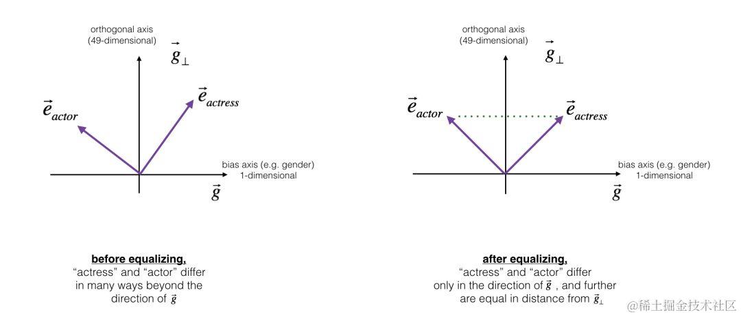 如何对两个单词除偏,比如:"actress“(“女演员”)和“actor”(“演员”)。均衡算法适用于您可能希望仅通过性别属性不同的单词对。举一个具体的例子,假设"actress“(“女演员”)比“actor”(“演员”)更接近“保姆”。通过将中和应用于"babysit"(“保姆”),我们可以减少与保姆相关的性别刻板印象。但是这仍然不能保证"actress“(“女演员”)和“actor”(“演员”)与"babysit"(“保姆”)等距。均衡算法可以解决这个问题。