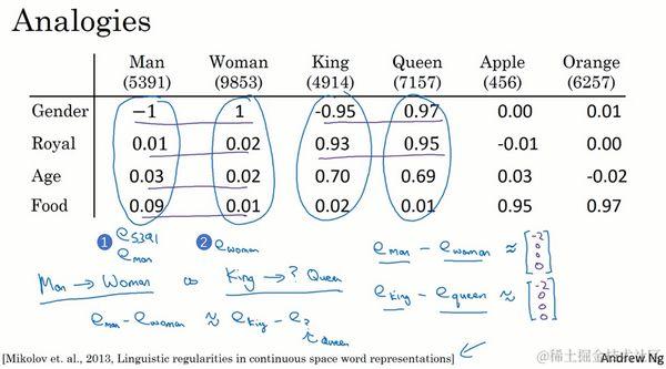 这是一系列你希望词嵌入可以捕捉的单词的特征表示,假如我提出一个问题,man如果对应woman,那么king应该对应什么?你们应该都能猜到king应该对应queen。能否有一种算法来自动推导出这种关系,下面就是实现的方法。
