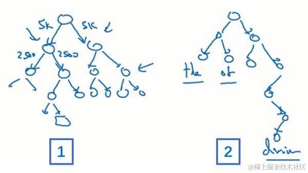 在文献中你会看到的方法是使用一个分级(hierarchical)的softmax分类器,意思就是说不是一下子就确定到底是属于10,000类中的哪一类。想象如果你有一个分类器(上图编号1所示),它告诉你目标词是在词汇表的前5000个中还是在词汇表的后5000个词中,假如这个二分类器告诉你这个词在前5000个词中(上图编号2所示),然后第二个分类器会告诉你这个词在词汇表的前2500个词中,或者在词汇表的第二组2500个词中,诸如此类,直到最终你找到一个词准确所在的分类器(上图编号3所示),那么就是这棵树的一个叶子节点。像这样有一个树形的分类器,意味着树上内部的每一个节点都可以是一个二分类器,比如逻辑回归分类器,所以你不需要再为单次分类,对词汇表中所有的10,000个词求和了。实际上用这样的分类树,计算成本与词汇表大小的对数成正比(上图编号4所示),而不是词汇表大小的线性函数,这个就叫做分级softmax分类器。