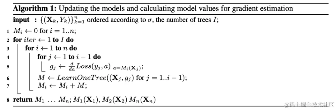 设 为构建 棵树后的模型, 为构建 棵树后第 个训练样本上面的梯度值。为了使得 无偏于模型 ,我们需要在没有 参与的情况下对模型 进行训练。由于我们需要对所有训练样本计算无偏的梯度估计,乍看起来对于 的训练不能使用任何样本,貌似无法实现的样子。我们运用下面这个技巧来处理这个问题:对于每一个样本 ,我们训练一个单独的模型 ,且该模型从不使用基于该样本的梯度估计进行更新。我们使用 来估计 上的梯度,并使用这个估计对结果树进行评分。用伪码描述如下,其中 是需要优化的损失函数, 是标签值, 是公式计算值。