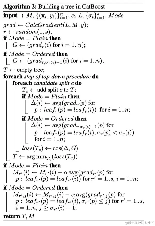 在Ordered boosting模式的学习过程当中,我们维持一个模型 ,其中 表示基于在序列 当中的前 个样本学习得到的模型对于第 个样本的预测。在算法的每一次迭代 ,我们从 当中抽样一个随机序列 ,并基于此构建第 步的学习树 。然后,基于 ,计算相应的梯度。接下来,我们会用余弦相似度来近似梯度 ,其中对于每一个样本 ,我们取梯度 。在候选分裂评估过程当中,第 个样本的叶子节点的值 由与 同属一个叶子的 的所有样本的前 个样本的梯度值 求平均得到。需要注意的是, 取决于选定的序列 ,因为 会影响第 个样本的Ordered TS。当树 的结构确定以后,我们用它来提升所有的模型 ,我们需要强调下,一个相同的树结构 会被用于所有的模型,但是会根据 和 的不同设置不同的叶子节点的值以后应用于不同的模型。