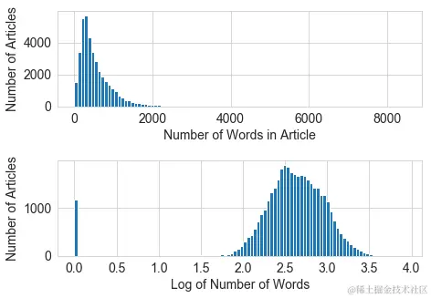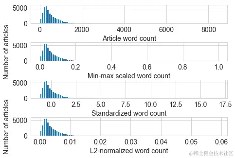 Figure 2-18. Original and scaled news article word counts. Note that only the scale of the x-axis changes; the shape of the distribution stays the same with feature scaling.
