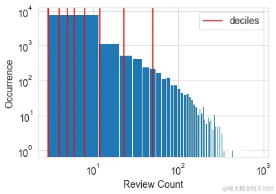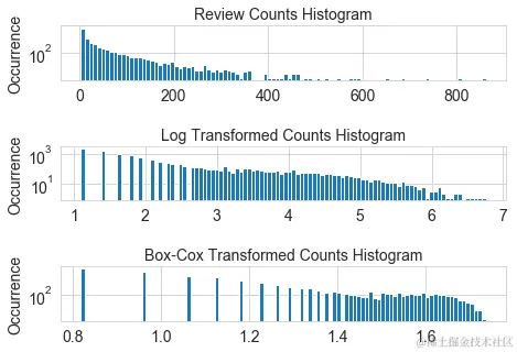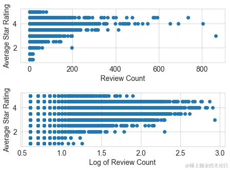 每个商户都有一个评论计数。假设我们的任务是使用协同过滤来预测用户可能给企业的评级。评论计数可能是一个有用的输入特征,因为通常在流行和良好的评级之间有很强的相关性。现在的问题是,我们应该使用原始评论计数或进一步处理它吗?图2-4显示了所有商户评论计数的直方图。我们看到和音乐听歌计数一样的模式。大部分的统计数字都很小,但一些企业有成千上万的评论。