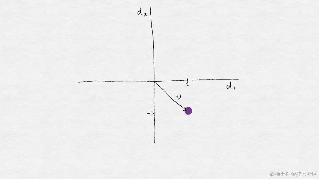 向量可以被可视化为空间中的一个点。(有时人们从原点到那一点画一条线和一个箭头。在这本书中,我们将主要使用这一点。例如,假设我们有一个二维向量 。也就是说,向量包含两个数,在第一方向 中,向量具有1的值,并且在第二方向 中,它具有 的值。我们可以在二维图中绘制 。