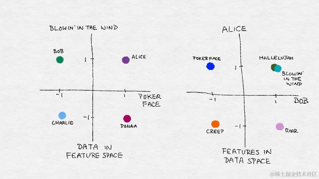 在数据世界中, 抽象向量及其特征维度具有实际意义。例如, 它可以代表一个人对歌曲的偏爱。每首歌都是一个特征, 其中1的值相当于大拇指向上, 个拇指向下。假设向量 表示一个听众 Bob 的喜好。Bob喜欢 Bob Dylan 的 “Blowin’ in the Wind” 和 Lady Gaga 的 "Poker Face"。其他人可能有不同的喜好。总的来说, 数据集合可以在特征空间中可视化为点云.