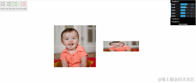查看上面的动态图可以发现,通过手动调整右上角的 xscale、yscale、rotate、xshear、yshear 等参数,可以随时调整变换后的图片。同事,左上角的变换矩阵也改变了。