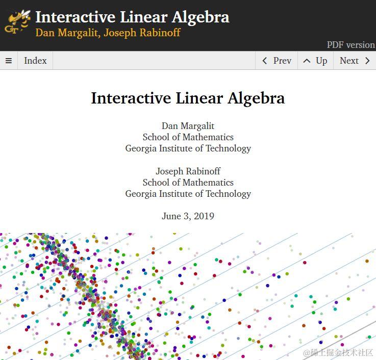 《交互式线性代数》的作者有两位:Dan Margalit 和 Joseph Rabinoff,均来自乔治亚理工学院的数学学院。教程完结于 2019 年 6 月 3 日,可以说是比较新的了。