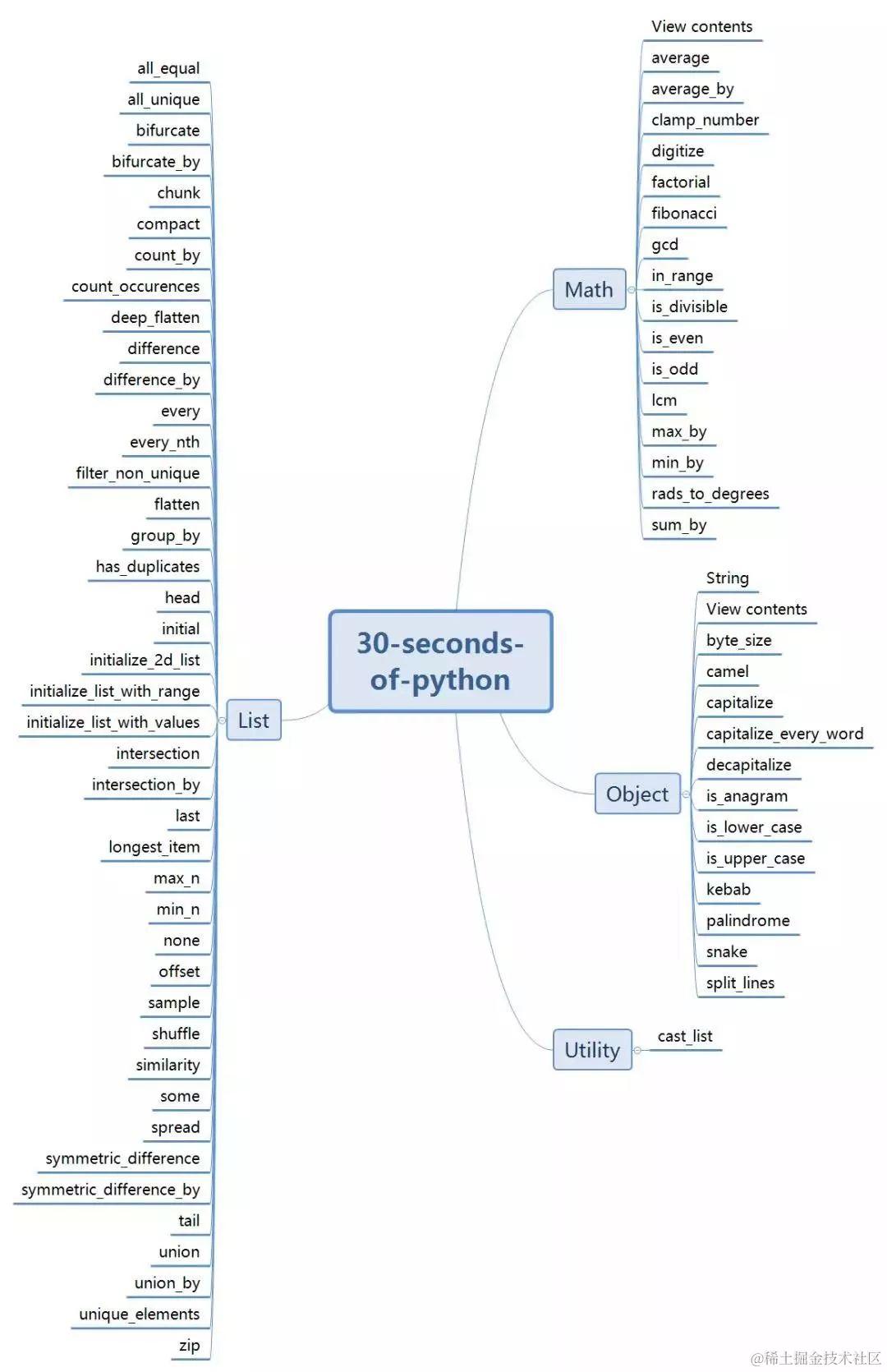 下面是30秒学Python的整个目录,分为几大板块:List、Math、Object、String、Utility,以下是整理的思维脑图。