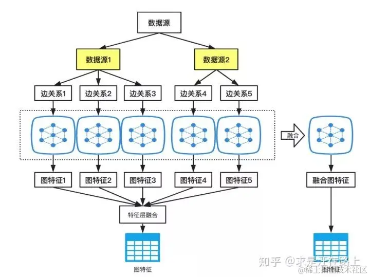 - 特征层融合 :对每个子网络独立构建图特征,在特征层中融合。该方案在实践中的优点在于方便直观,可并行;缺点在于工作量大,如果有a个数据源,每个数据源可提取b种关系的边,又有c个节点特征,此时就会衍生出 a ✖ b ✖ c个特征。在建模中,也不可能对这所有的特征入模,需要开展大量的特征筛选工作。