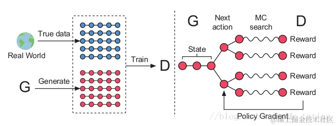 而在 中,生成器每生成一个 时,都会计算该 在生成分别中的概率,并且利用上一次训完的判别器计算出相应的 ,这个 可以理解为生成该 的权重?经过几轮的训练后, 越大的 越正向,越容易生成(这其实是强化学习的思想)。这里面就不需要判别器反向传梯度给生成器了。这就避免了梯度的微调导致不适用在离散的样本上?