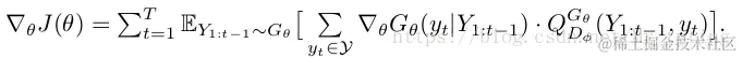 如何理解上式呢?其中 可理解为一个完整句子的 之和, 表示初始状态, 表示生成器的参数。后面的求和过程表示,每生成一个 ,我们都会计算其生成该 的概率与其对应的 值,那么两者相乘即表示生成该 的期望 值。求和后即为该整句的期望 值。生成器的目标就是不断的 。至于 为啥表示成 ,因为 是由后面判别器 决定的。
