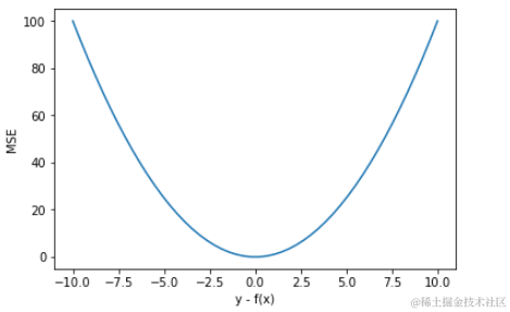 为了简化讨论,忽略下标 i,m = 1,以 y-f(x) 为横坐标,MSE 为纵坐标,绘制其损失函数的图形: