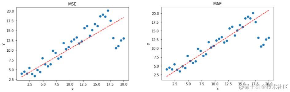 显然,使用 MAE 损失函数,受离群点的影响较小,拟合直线能够较好地表征正常数据的分布情况。这一点,MAE 要优于 MSE。二者的对比图如下: