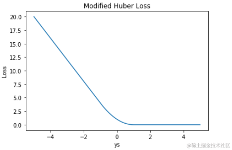 从表达式和 Loss 图形上看,Modified Huber Loss 结合了 Hinge Loss 和 交叉熵 Loss 的优点。一方面能在 ys > 1 时产生稀疏解提高训练效率;另一方面对于 ys < −1 样本的惩罚以线性增加,这意味着受异常点的干扰较少。scikit-learn 中的 SGDClassifier 就使用了 Modified Huber Loss。