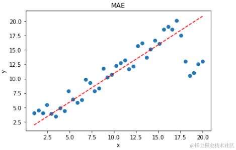 值得一提的是,MAE 相比 MSE 有个优点就是 MAE 对离群点不那么敏感,更有包容性。因为 MAE 计算的是误差 y-f(x) 的绝对值,无论是 y-f(x)>1 还是 y-f(x)<1,没有平方项的作用,惩罚力度都是一样的,所占权重一样。针对 MSE 中的例子,我们来使用 MAE 进行求解,看下拟合直线有什么不同。