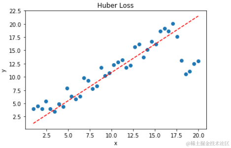 可见,使用 MSE 损失函数,受离群点的影响较大,虽然样本中只有 5 个离群点,但是拟合的直线还是比较偏向于离群点。这往往是我们不希望看到的。