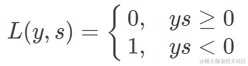 - 0-1 Loss 对每个错分类点都施以相同的惩罚(损失为 1),这样对犯错比较大的点(ys 远小于 0)无法进行较大的惩罚,所有犯错点都同等看待,这不符合常理,不太合适。
