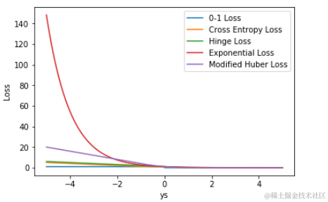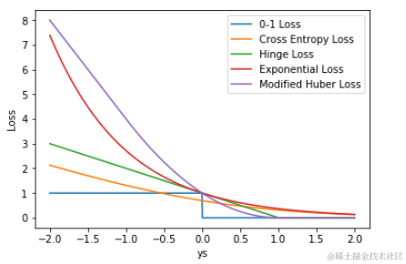 这里的 ys 类似与回归模型中的残差 s - y。因此,在比较分类问题的各个损失函数的时候,我们就可以把 ys 当作自变量 x 轴即可,这样更加方便。
