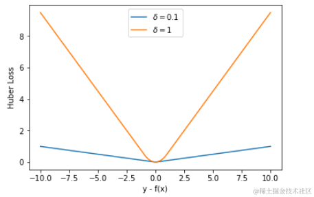通常来说,超参数 δ 可以通过交叉验证选取最佳值。下面,分别取 δ = 0.1、δ = 10,绘制相应的 Huber Loss,如下图所示: