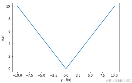 为了简化讨论,忽略下标 i,m = 1,以 y-f(x) 为横坐标,MAE 为纵坐标,绘制其损失函数的图形: