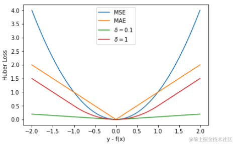 Huber Loss 是对二者的综合,包含了一个超参数 δ。δ 值的大小决定了 Huber Loss 对 MSE 和 MAE 的侧重性,当 |y−f(x)| ≤ δ 时,变为 MSE;当 |y−f(x)| > δ 时,则变成类似于 MAE,因此 Huber Loss 同时具备了 MSE 和 MAE 的优点,减小了对离群点的敏感度问题,实现了处处可导的功能。