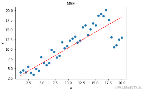 如果样本中存在离群点,MSE 会给离群点赋予更高的权重,但是却是以牺牲其他正常数据点的预测效果为代价,这最终会降低模型的整体性能。我们来看一下使用 MSE 解决含有离群点的回归模型。