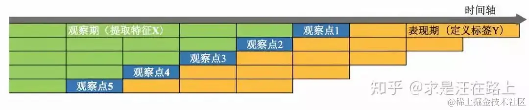 - 观察期 (Observation Window):用以 构造特征X 的时间窗口。相对于观察点而言,是 历史 时间。观察期的选择依赖于用户数据的厚薄程度。通常数据越厚,可提取的信息也就越全面、可靠。