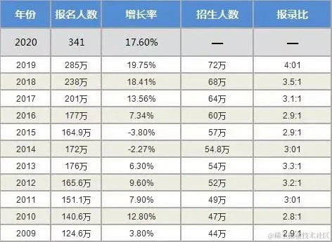 2020 年考研报名人数达到了 341 万人,比去年多了五十多万人。这两年,考研的报录比是 4 : 1,相较于前几年的 3 : 1,从数据上来看,考研人数上升很快,难度提升了一些。
