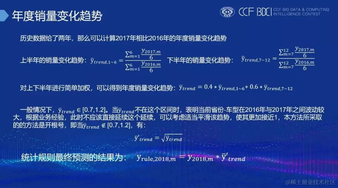 规则部分的框架是使用历史同期销量,历史最近销量与指数平滑进行加权得到一个初步预测销量,然后用上下半年的销量变化趋势与平滑构造年度销量变化趋势,最后两者相乘即可得到规则的预测结果。