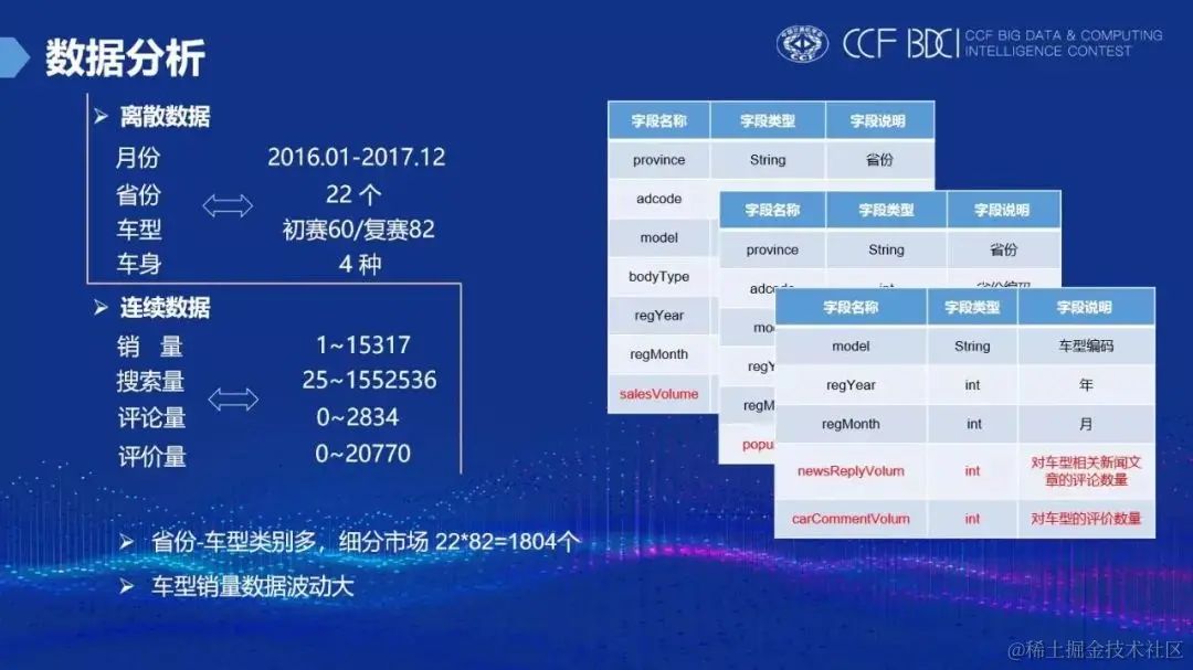 赛题需要参赛队伍根据给出的60款车型在22个细分市场(省份)的销量连续24个月(从2016年1月至2018年12月)的销量数据,建立销量预测模型;基于该模型预测同一款车型和相同细分市场在接下来一个季度连续4个月份的销量;除销量数据外,还提供同时期的用户互联网行为统计数据,包括:各细分市场每个车型名称的互联网搜索量数据;主流汽车垂直媒体用户活跃数据等。参赛队伍可同时使用这些非销量数据用于建模。