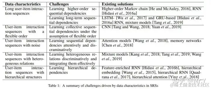 由于现实场景中用户购物行为,商品特征和特定购物环境的多样性和复杂性,user-item interaction data通常具有不同的特点。不同的数据特特点本给SRS带来了不同的挑战,需要不同的解决方案,如表1所示。在以下五个小节中,我们分别讨论了由不同数据特点引起的SRS的五个关键挑战。在每个小节中,我们首先介绍特定的数据特点,然后说明相应的挑战。