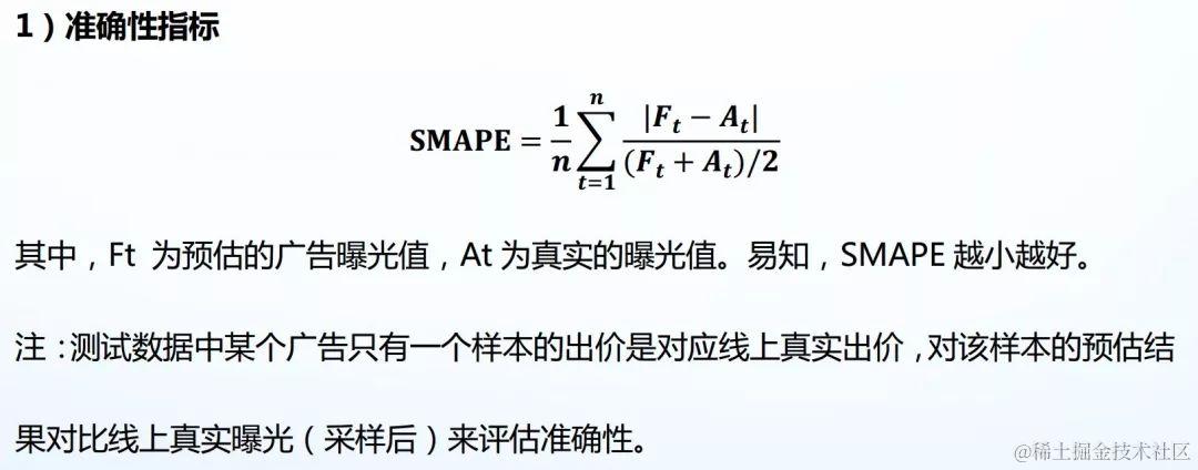 最后,规则模型还有助于对模型的优化。第一点就提到了新广告的曝光数据直接填充0,模型的分数就可以很高,这说明了数据分布很接近0,那么这就启发了很多参赛队员要对线上的准确性指标进行优化。如下图所示,可以看出准确性指标肯定是越小说明模型的分数更高。但是如果真实值和目标值都是0的话,准确性指标函数就变为0了,所以我们就需要对模型的训练loss进行平滑,参见上一篇推送文章“腾讯比赛总反思-附top选手的方案”,可以发现很多top选手在训练LGB或者NN模型的时候都进行了平滑,这样可以保证自己模型的训练loss变化跟线上的评分比较贴合,从而可以通过线下Loss变化来猜测线上的变化。