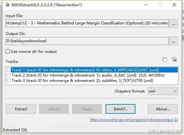 用MKVExtractGUI.exe直接打开mkv视频,勾选Track 3,即可分离出srt格式的字幕。