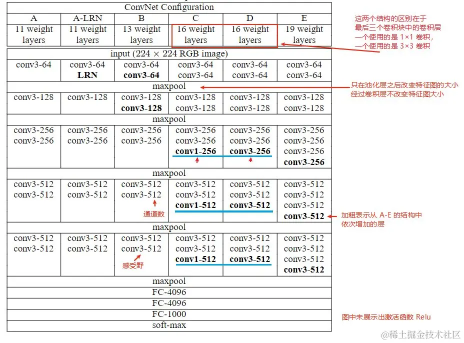 在《Very Deep Convolutional Networks for Large-Scale Image Recognition》论文中,作者给出了 6 个 VGG 模型,对应不同的网络结构和深度,具体结构如下: