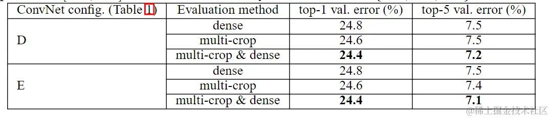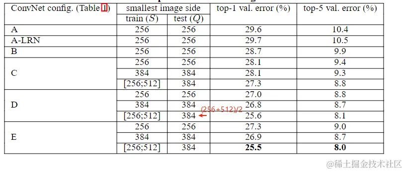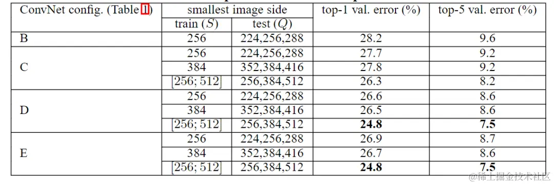 在单尺度上评估 ConvNet 模型后,我们现在评估测试时尺度抖动的影响。它包括在一张测试图像的几个归一化版本上运行模型(对应于不同的 Q 值),然后对所得到的类别后进行平均。考虑到训练和测试尺度之间的巨大差异会导致性能下降,用固定 S 训练的模型在三个测试图像尺度上进行了评估,接近于训练的尺度:Q = {S−32, S, S+32}。同时,训练时的尺度抖动允许网络在测试时应用于更广的尺度范围,所以用变量 S ∈ [Smin; Smax] 训练的模型在更大的尺寸范围 Q = {Smin, 0.5 (Smin + Smax), Smax} 上进行评估。