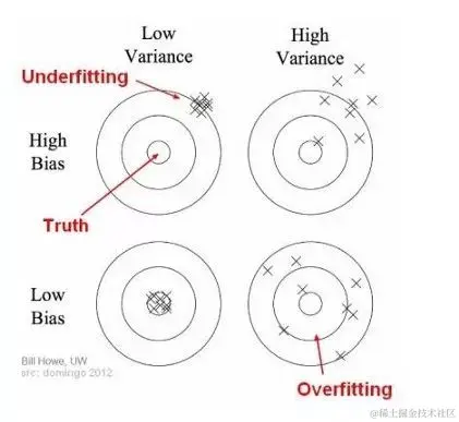 我们可以改变模型,这样我们就可以尽可能地增加落入圆中心的模型猜测的数量。需要在偏差值和方差值之间取得平衡。如果我们的模型过于简单,参数很少,那么它可能有高偏差和低方差。