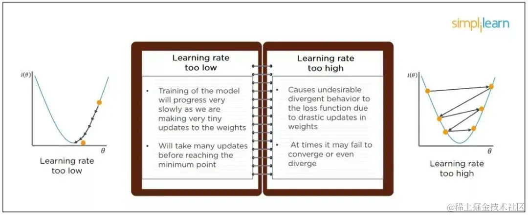 当模型的学习率被设置得太低时,模型训练将会进行得非常慢,因为它对权重进行非常小的更新。在到达局部最优点之前需要多次更新。\